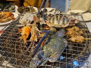มังกรซีฟู้ดส์ สาขาราษฎร์บูรณะ ซึ่งเป็นร้านบุฟเฟ่ต์ทะเลเผา ไม่จำกัดเวลา ราคา 499 บาท ราคานี้ยังไม่รวมค่าเครื่องดื่มรีฟิล 59 บาท